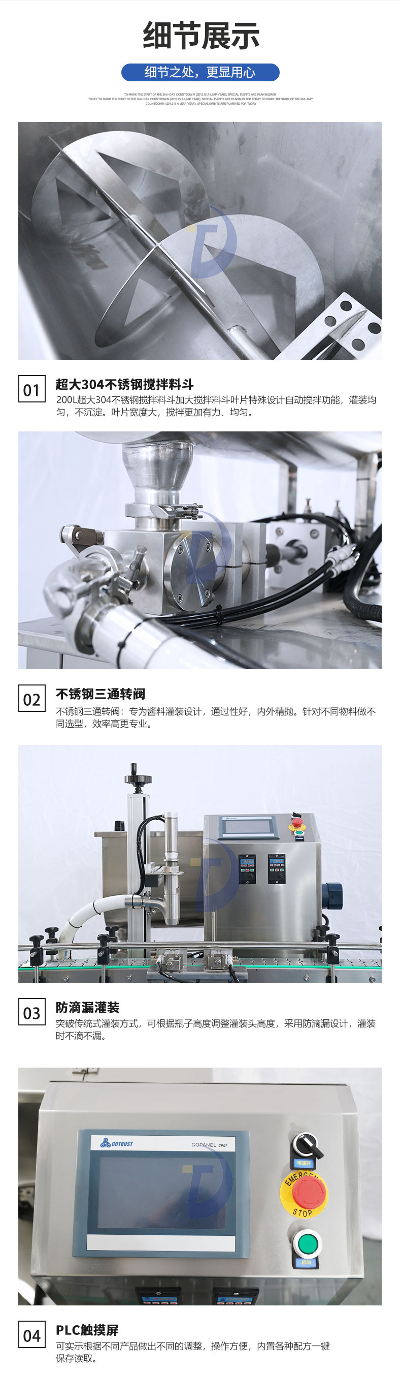 • 用于辣椒醬、拌面醬、豆排醬、大塊肉醬、油辣醬、 番茄醬、花生醬等醬料的定量充填分裝。 304不銹鋼食品級(jí)材質(zhì) 加大三通轉(zhuǎn)閥大顆粒醬可灌 加大攪拌料斗計(jì)量更準(zhǔn)確...