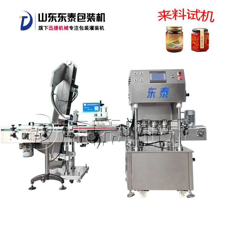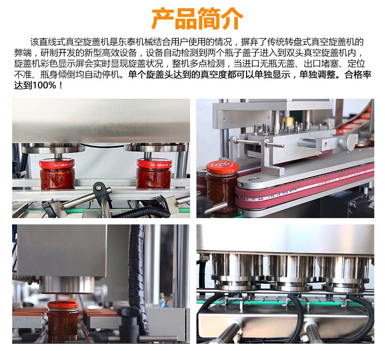 該直線式真空旋蓋機(jī)是東泰機(jī)械結(jié)合用戶使用情況,摒棄了傳統(tǒng)轉(zhuǎn)盤式真空旋蓋機(jī)的弊端,研制開(kāi)發(fā)的新型高效設(shè)備,設(shè)備自動(dòng)檢測(cè)到兩個(gè)瓶子蓋子進(jìn)入到雙頭真空旋蓋機(jī)內(nèi),旋蓋機(jī)彩色顯示屏?xí)?shí)時(shí)顯示旋蓋狀況,整機(jī)多點(diǎn)檢測(cè),當(dāng)進(jìn)口無(wú)瓶無(wú)蓋、出口堵塞、定位不準(zhǔn)、瓶身傾倒均自動(dòng)停機(jī)。單個(gè)旋蓋頭達(dá)到的真空度都可以單獨(dú)顯示,單獨(dú)調(diào)整。合格